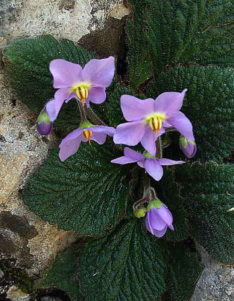 Pertenece a una familia tropical, que en Europa constituyen una reliquia de la época preglaciar y que está representada por cinco especies, de las que 3 corresponden al géneroRamonda; las otras dos especies del género viven en la Península balcánica. El géneroRamonda se caracteriza por tener las anteras libres y el tubo de la corola más corto que los lóbulos. Esta especie se caracterizapor su roseta de hojas con pecíolo hasta de 7cm y lámina ovadaa rómbico-orbicularde 2-8 cm, con margen crenadoa serrato dentado, rugosas, peludas, de pelos blancospor el haz y cubierta de pelos ferrugíneos por el envés; de la roseta salen unos pocos pedúnculos floralesde 6-15 cm, glandulosos y que llevan de 1 a 6de flores; éstas son muy llamativas, de 2-3.5cm de diámetro, con cinco pétalos de color violeta y mancha anaranjada o amarilla en el centro; el fruto es una cápsula ovoide-elíptica, con pelos glandulíferos, aguda de 1-1,5 cm.